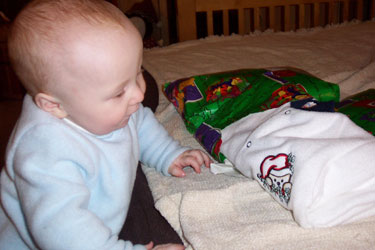 me opening my jammies so that Nana Ruth could see how much I love them.