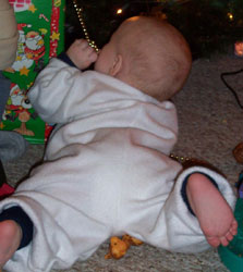 We had a pretty good Christmas. I got lots of toys, movies, books and clothes. I got a walker/ride on toy since I learned how to pull myself up on Christmas Eve, so now I can go around the house with Mom. I can even stand up by myself unassisted, hopefully my new walker will help me walk soon so I can chase down our kitties. I also got lots of Little People toys: Noah's Ark, the Nativity Scene, Discovery Airport, the zoo and the amusement park (from Auntie Kayla). I got lots of Veggie Tales movies, books and a Cd (from Nana & Papa). Auntie Jeni got me a pull along horse toy. I also got a Crawl & Cruise playground, Stand up Ball toy, Workshop, Kitchen, cash register and lots more toys. Grandma & Grandpa McElligott got me a very nice sweater outfit, Mom & Dad got me lots of clothes, Nana & Papa got me undershirts and some outfits, Great Nana & Auntie Rae & Uncle Dan got me clothes too. I'm going to be one stylish boy this year! I also received many different books, and movies. I got so much stuff I can't even remember it all.